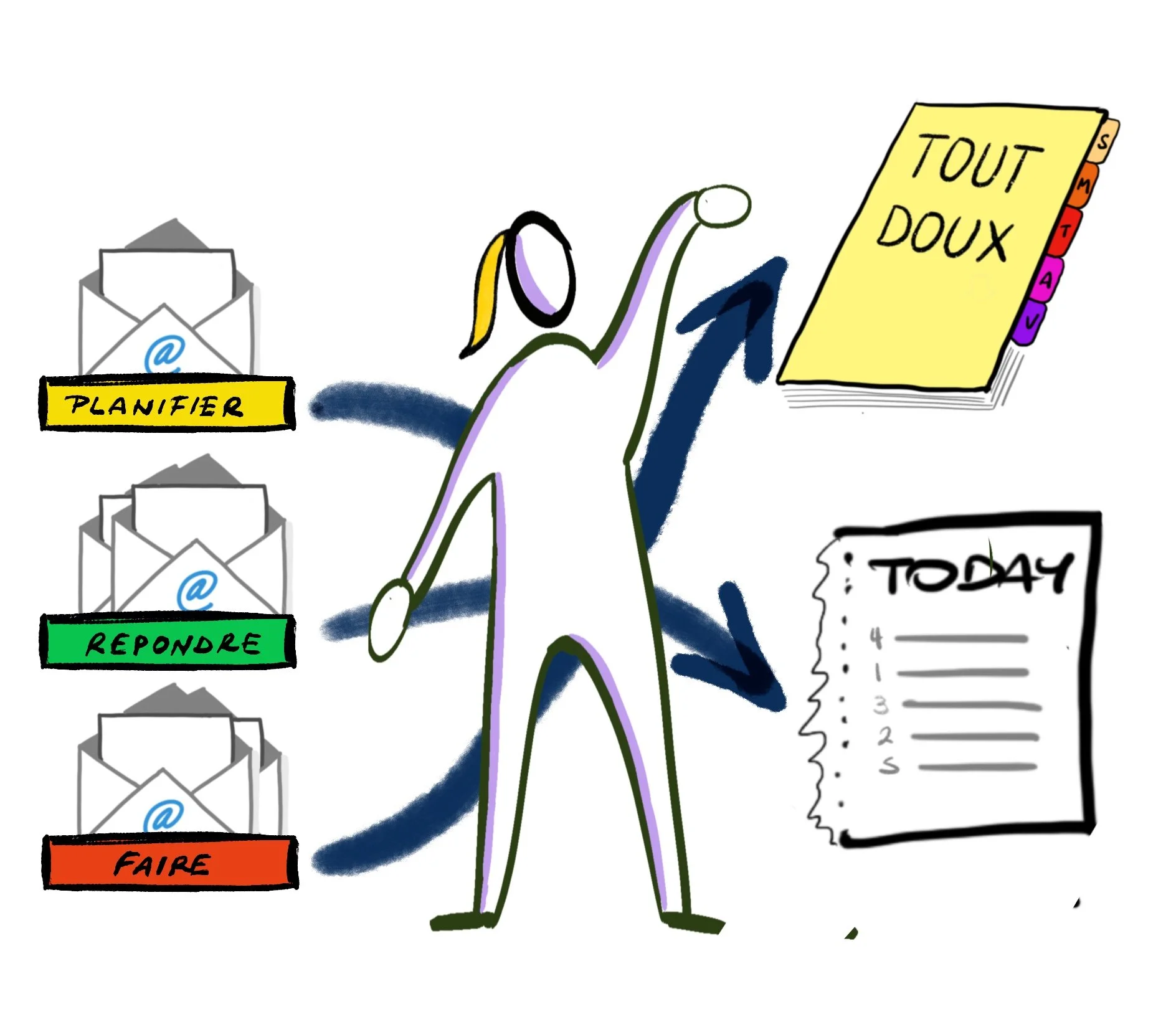 Où en sommes-nous désormais ? Nous disposons d'une entrée de journal prête à recueillir nos hauts faits de la journée. Côté emails, notre boîte d'arrivée est vide. Les emails dont nous n'avons rien à faire sont au fond de la poubelle, et ceux que nous voulons simplement garder pour référence future sont dans un dossier Archives. Quant à ceux qui réclament notre décision et/ou notre action, ils sont ventilés en fonction du type de chose qui nous est demandé dans les trois dossiers "À planifier/À répondre/À faire". Certains d'entre eux ont été traités rapidement ("moins de 2 minutes"), et ils ont par conséquent été retirés ensuite du dossier "À xxx" qui les hébergeait jusque-là. D'autres ont été ajoutés à notre TOUT DOUX List pour exécution ultérieure, et enfin une autre partie a commencé à venir peupler la liste des choses à faire aujourd'hui même, notre TODAY list.