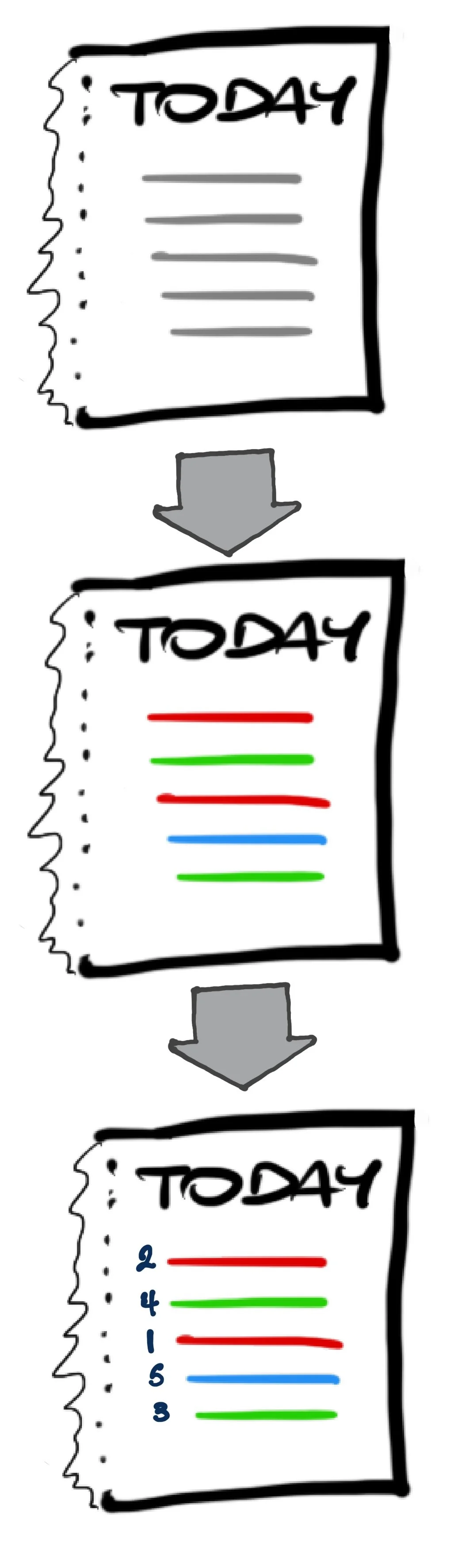Notre TODAY list est ébauchée au cours de notre parcours des 3 dossiers contenant notre stock d'emails À planifier/À répondre/À faire. Si nous y identifions quelque chose qui peut être mené à bien en moins d'une journée (une "tâche" dans la langue parlée sur l'île de Robinson) ET qu'il est juste et bon de mener à bien cette tâche aujourd'hui même, alors notre TODAY list s'enrichit d'une ligne nouvelle. Cette ligne n'est pas encore complète (elle le deviendra grâce à l'ultime rituel suivant), mais notre plan de journée commence doucement à prendre forme.